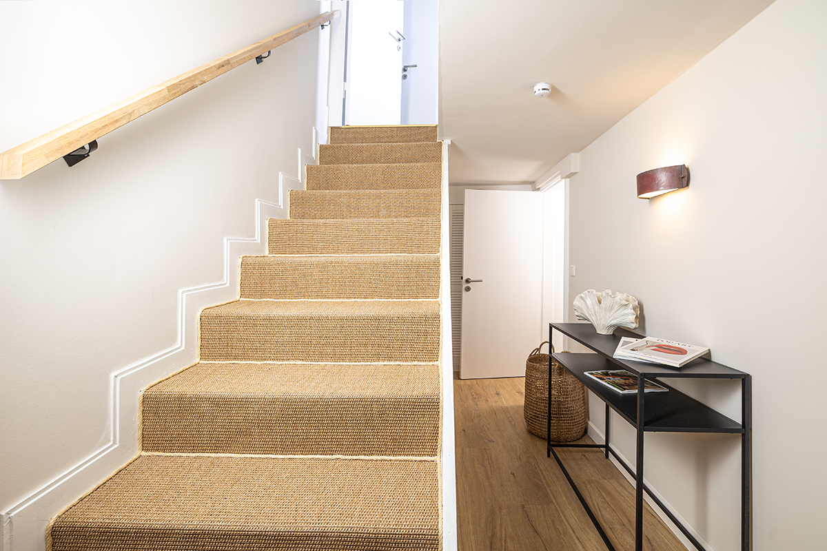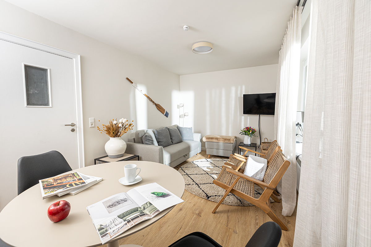 Der helle Wohnbereich mit neuen Design-Möbeln, harmonischen Farben und komfortabler Couch lädt zum Zurücklehnen und Abschalten ein. Im separaten Esszimmer genießen Sie gemeinsame Mahlzeiten in einem eleganten, modernen Ambiente mit Platz für bis zu vier Personen.