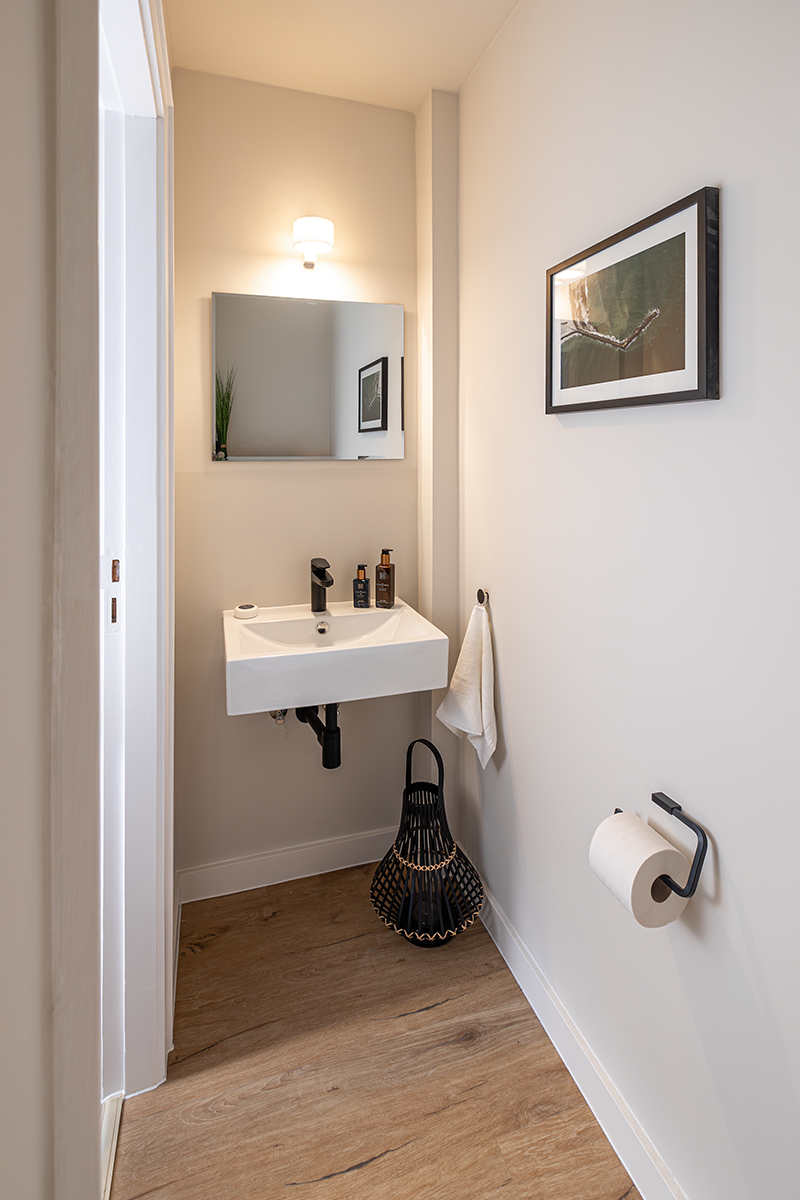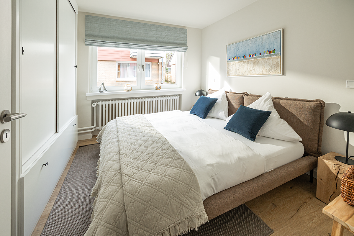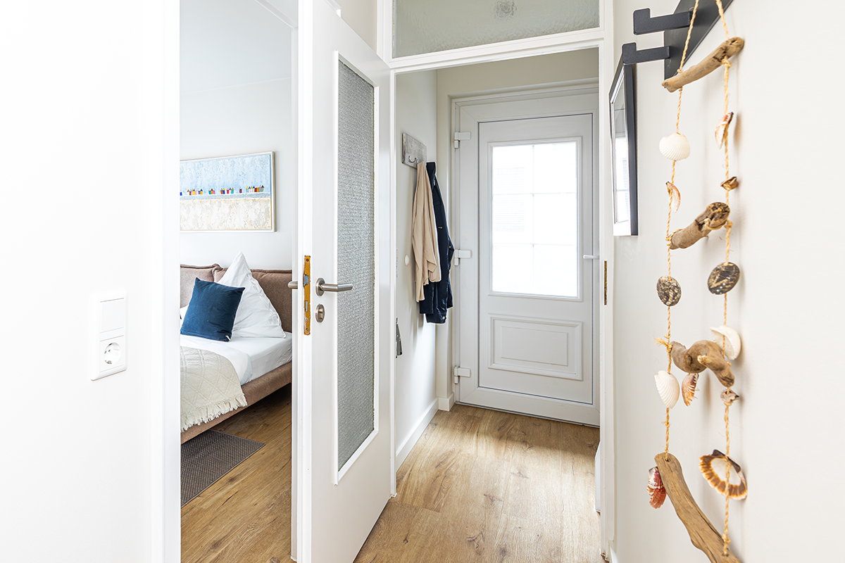 Diese Privatunterkunft auf Helgoland verfügt über zwei geschmackvoll gestaltete Schlafzimmer – eines mit Doppelbett, eines mit zwei Einzelbetten – die mit ruhigen Farbtönen und hochwertigen Materialien eine besonders entspannte Atmosphäre schaffen.